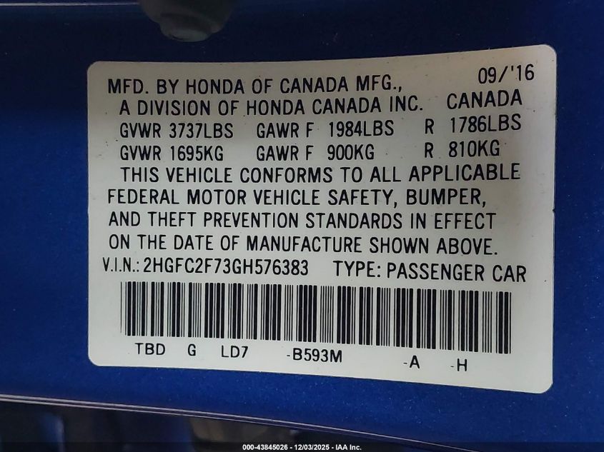 2016 HONDA CIVIC 2016 року Бензин, 2.0, Передний привод, vin - 2HGFC2F73GH576383 из США
