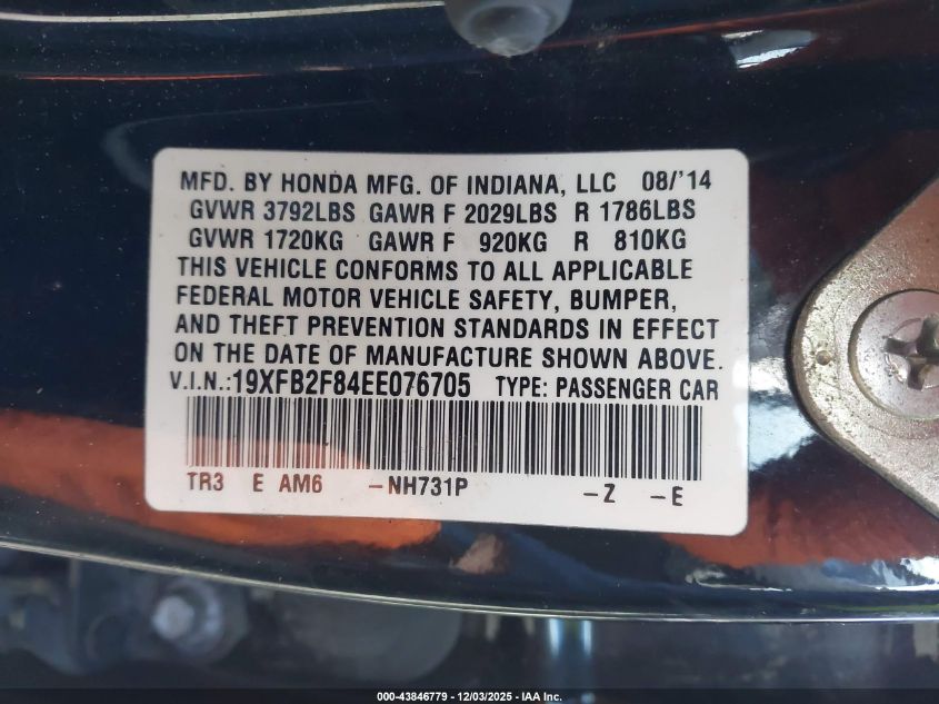 2014 HONDA CIVIC 2014 року Бензин, 1.8, Передний привод, vin - 19XFB2F84EE076705 из США