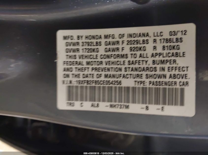 2012 HONDA CIVIC 2012 року Бензин, 1.8, Передний привод, vin - 19XFB2F85CE054256 из США