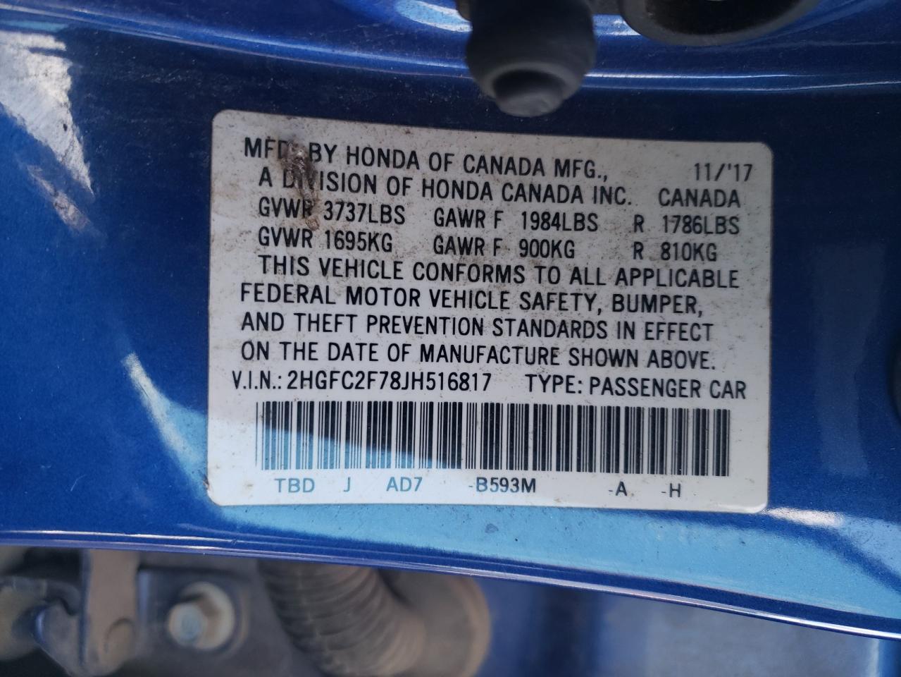 Цвет СинийЦилиндры 4VIN 2HGFC2F78JH516817Состояние Заводится и едет (проверено)Повреждения Передняя или задняя AutoRIA
