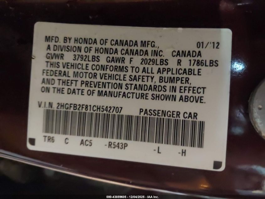 2012 HONDA CIVIC 2012 року Бензин, 1.8, Передний привод, vin - 2HGFB2F81CH542707 из США