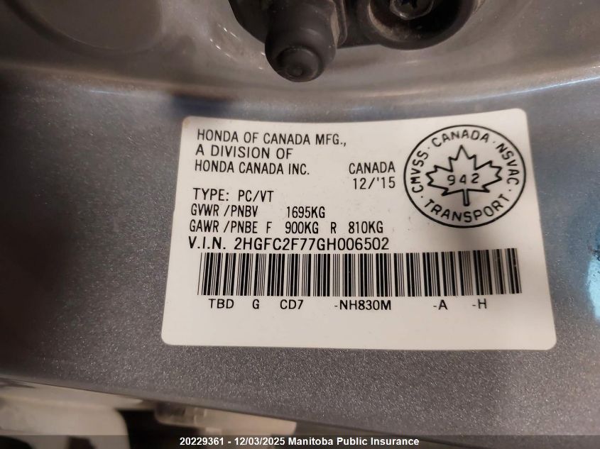 Цвет СерыйЦилиндры 4Привод Передний приводVIN 2HGFC2F77GH006502Состояние СтационарноПовреждения Передняя леваяДата аукциона 2025-12-10 AutoRIA