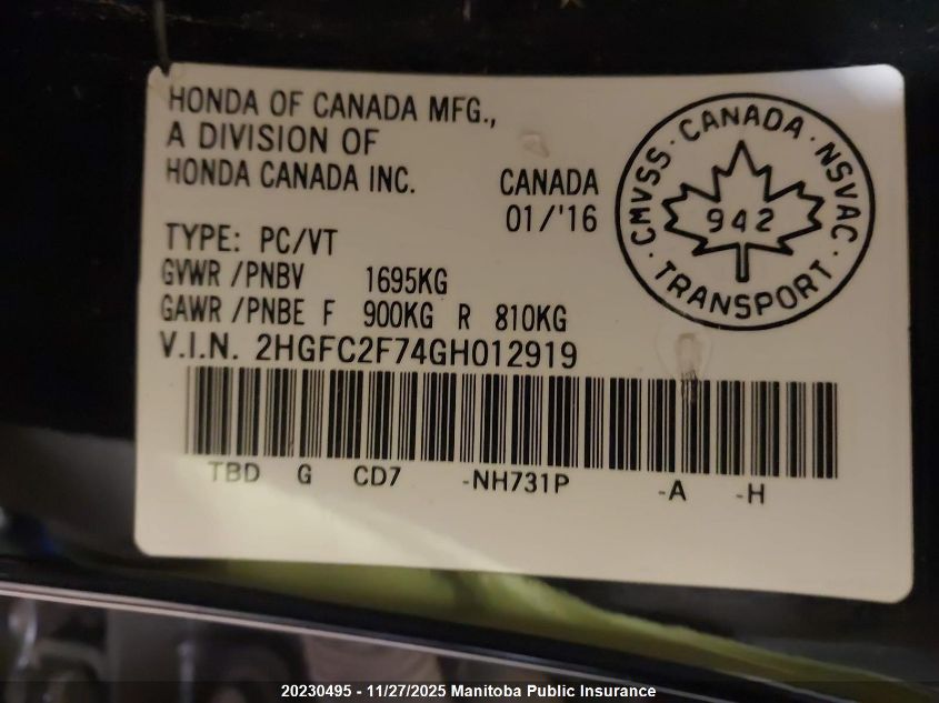 2016 HONDA CIVIC 2016 року Бензин, , Передний привод, vin - 2HGFC2F74GH012919 из США