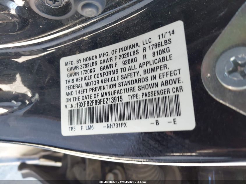 2015 HONDA CIVIC 2015 року Бензин, 1.8, Передний привод, vin - 19XFB2F89FE213915 из США