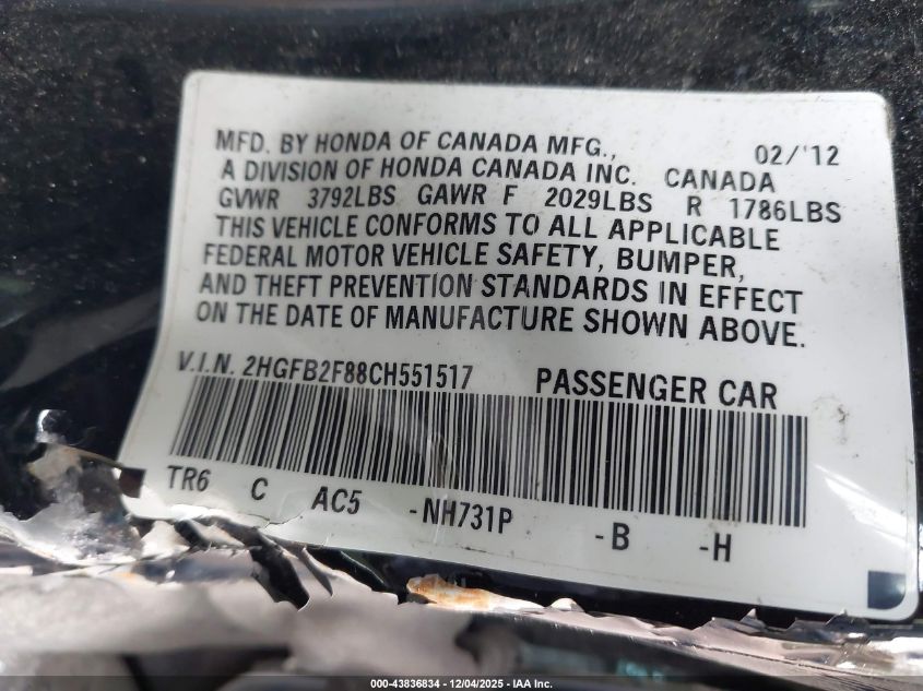 2012 HONDA CIVIC 2012 року Бензин, 1.8, Передний привод, vin - 2HGFB2F88CH551517 из США