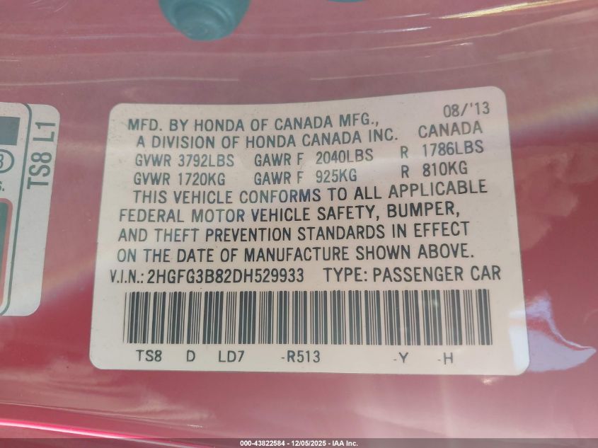 2013 HONDA CIVIC 2013 року Бензин, 1.8, Передний привод, vin - 2HGFG3B82D8529933 из США