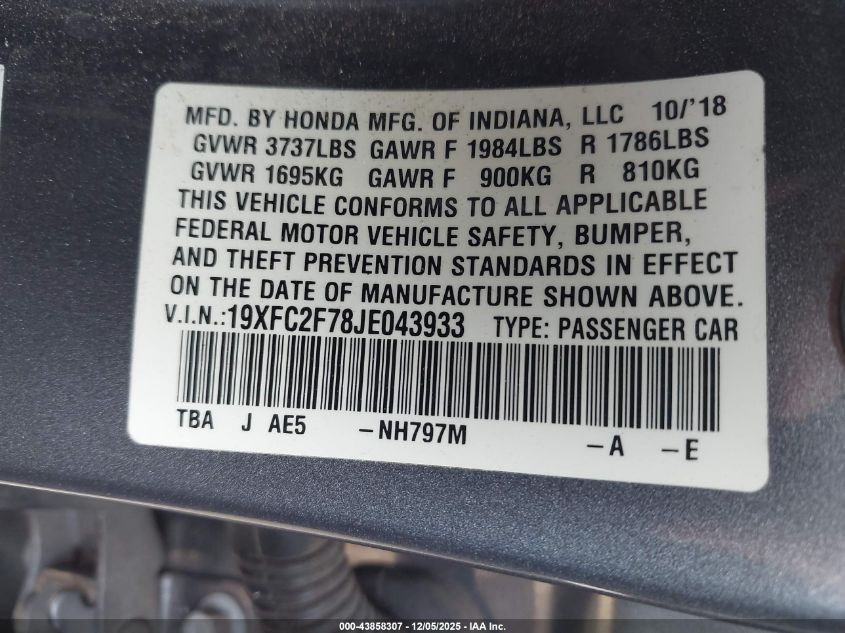 2018 HONDA CIVIC 2018 року Бензин, 2.0, Передний привод, vin - 19XFC2F78JE043933 из США