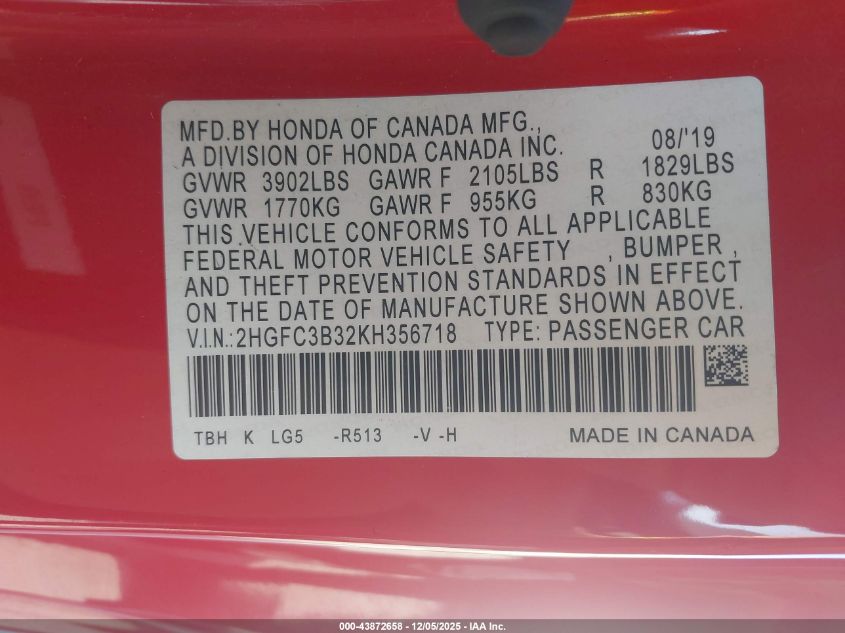 2019 HONDA CIVIC 2019 року Бензин, 1.5, Передний привод, vin - 2HGFC3B32KH356718 из США