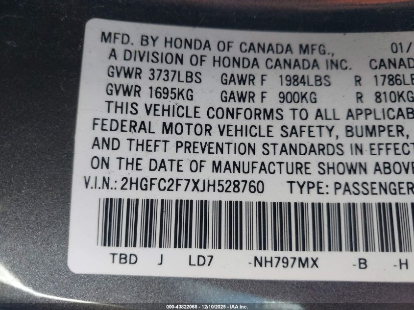 2018 HONDA CIVIC 2018 року Бензин, 2.0, Передний привод, vin - 2HGFC2F7XJH528760 из США