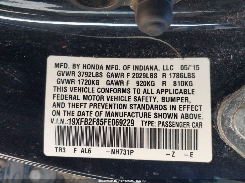 2015 HONDA CIVIC 2015 року Бензин, 1.8, Передний привод, vin - 19XFB2F85FE069229 из США