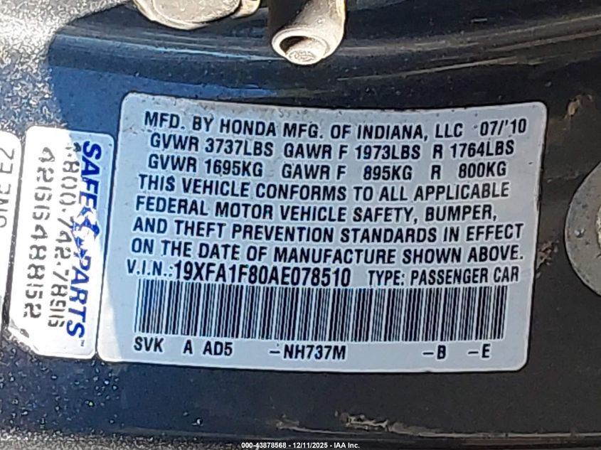 2010 HONDA CIVIC 2010 року Бензин, 1.8, Передний привод, vin - 19XFA1F80AE078510 из США