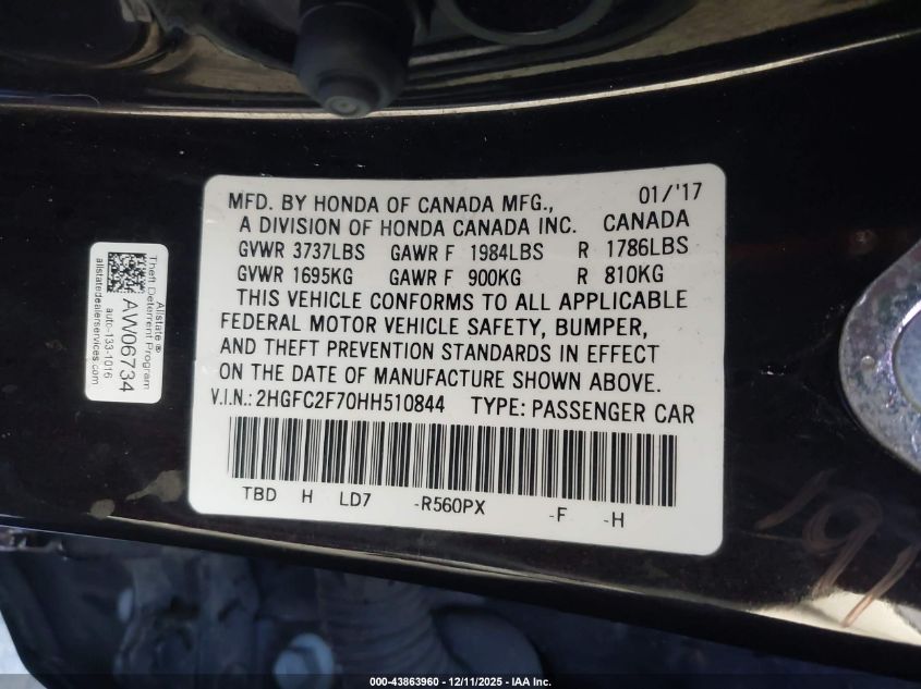 2017 HONDA CIVIC 2017 року Бензин, 2.0, Передний привод, vin - 2HGFC2F70HH510844 из США