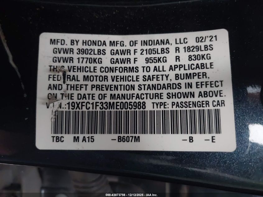 2021 HONDA CIVIC 2021 року Бензин, 1.5, Передний привод, vin - 19XFC1F33ME005988 из США