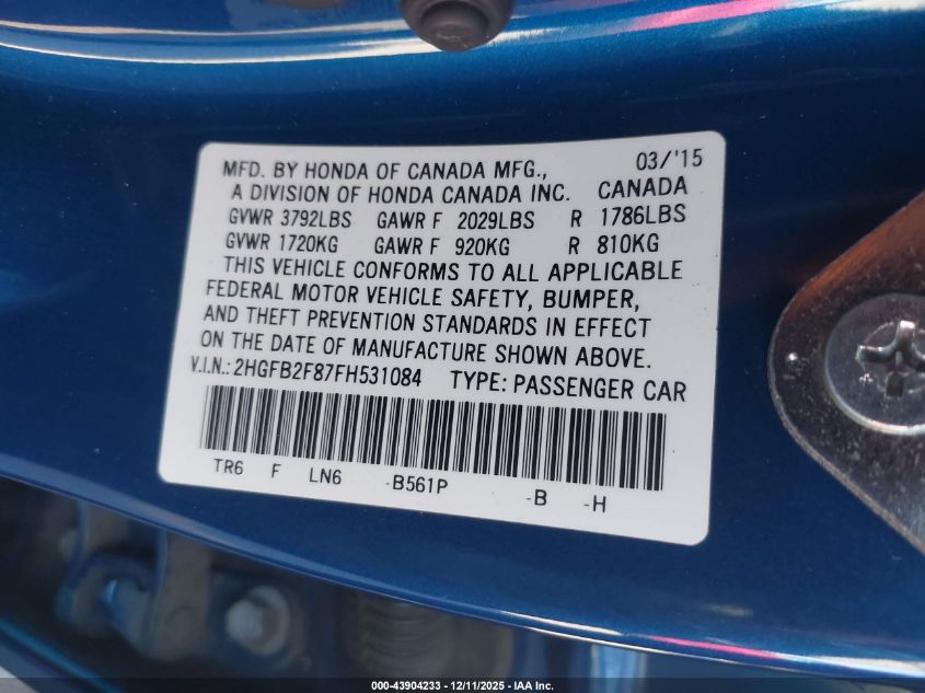 2015 HONDA CIVIC 2015 року Бензин, 1.8, Передний привод, vin - 2HGFB2F87FH531084 из США