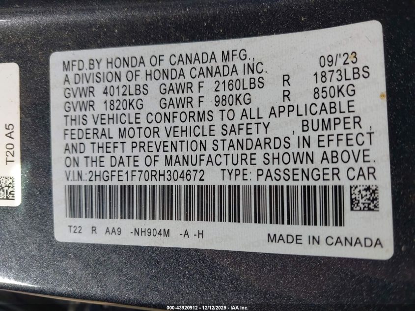 2024 HONDA CIVIC 2024 року Бензин, 1.5, Передний привод, vin - 2HGFE1F70RH304672 из США