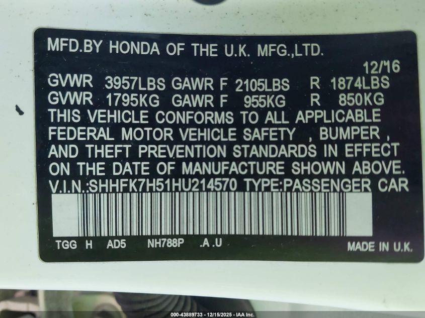 2017 HONDA CIVIC 2017 року Бензин, 1.5, Передний привод, vin - SHHFK7H51HU214570 из США