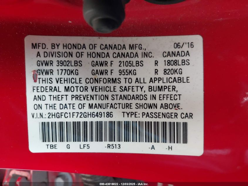 2016 HONDA CIVIC 2016 року Бензин, 1.5, Передний привод, vin - 2HGFC1F72GH649186 из США