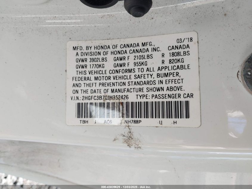 Цвет БелыйЦилиндры 4Привод Передний приводVIN 2HGFC3B70JH352426Состояние СтационарноПовреждения Передняя или задняя AutoRIA