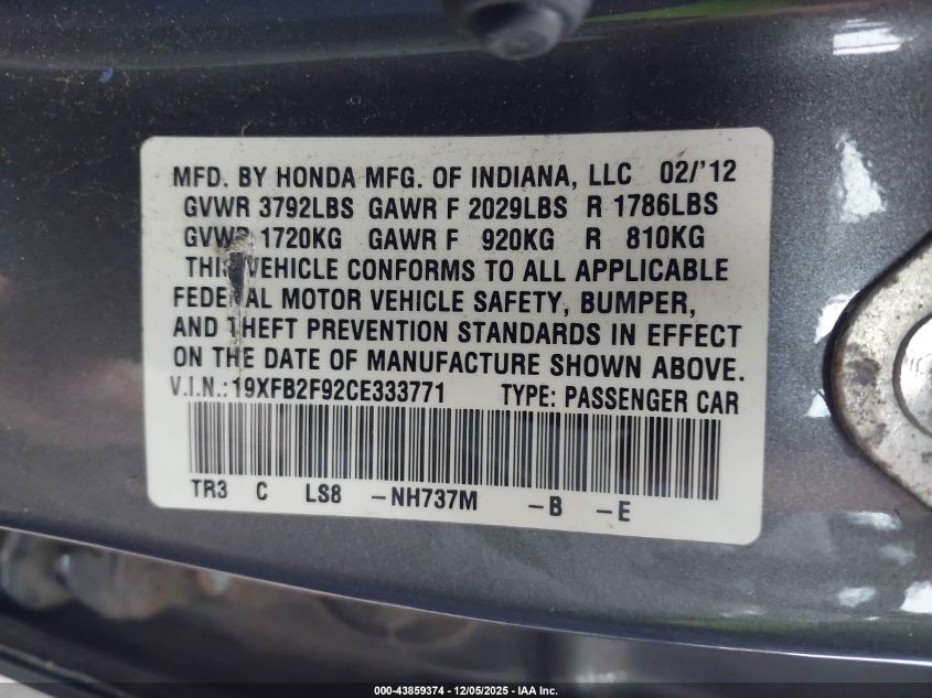 Цвет СерыйЦилиндры 4Привод Передний приводVIN 19XFB2F92CE333771Состояние Заводится и едет (проверено)Повреждения Правая сторона AutoRIA
