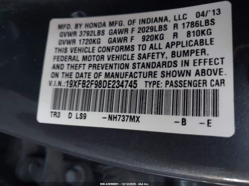 2013 HONDA CIVIC 2013 року Бензин, 1.8, Передний привод, vin - 19XFB2F98DE234745 из США