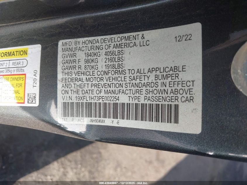 2023 HONDA CIVIC 2023 року Бензин, 1.5, Передний привод, vin - 19XFL1H73PE002254 из США