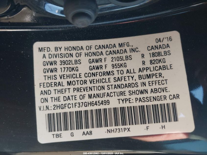 2016 HONDA CIVIC 2016 року Бензин, 1.5, Передний привод, vin - 2HGFC1F37GH645499 из США