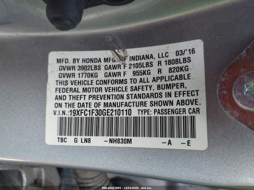 2016 HONDA CIVIC 2016 року Бензин, 1.5, Передний привод, vin - 19XFC1F30GE210110 из США