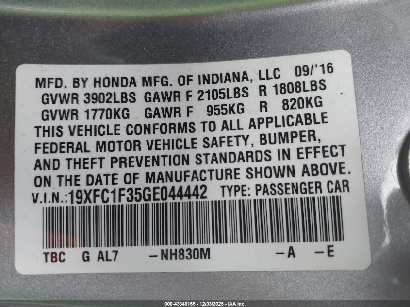 2016 HONDA CIVIC 2016 року Бензин, 1.5, Передний привод, vin - 19XFC1F35GE044442 из США