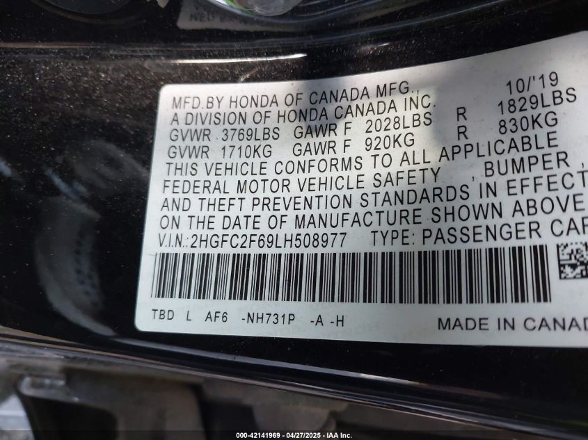 2020 HONDA CIVIC 2020 року Бензин, 2.0, Передний привод, vin - 2HGFC2F69LH508977 из США