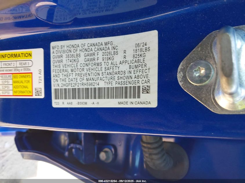 2024 HONDA CIVIC 2024 року Бензин, 2.0, Передний привод, vin - 2HGFE2F21RH596214 из США