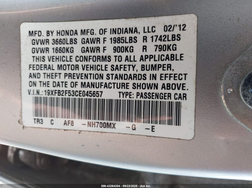 2012 HONDA CIVIC 2012 року Бензин, 1.8, Передний привод, vin - 19XFB2F53CE045657 из США