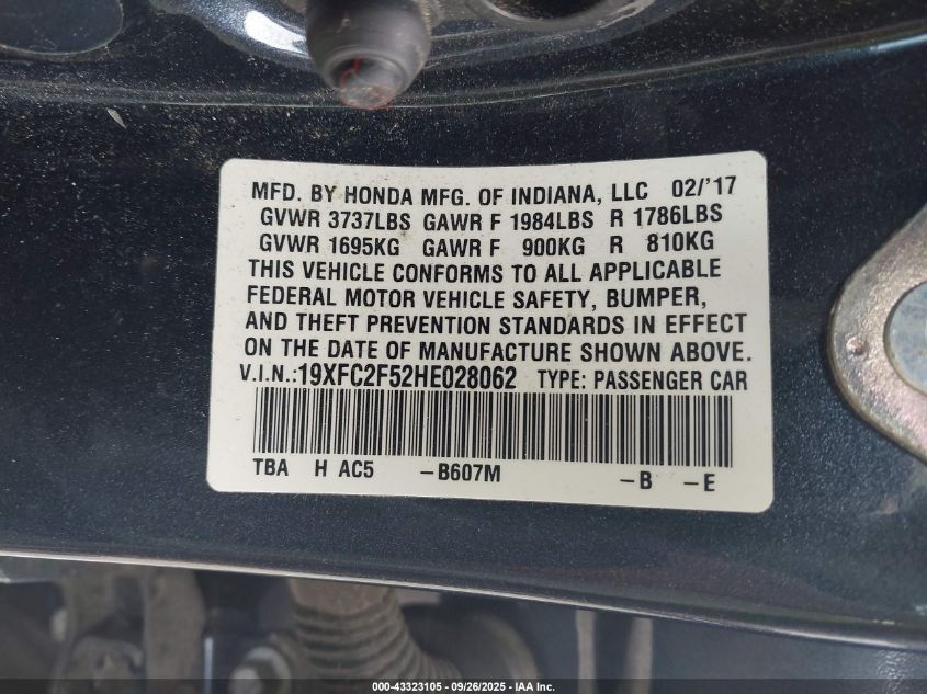 2017 HONDA CIVIC 2017 року Бензин, 2.0, Передний привод, vin - 19XFC2F52HE028062 из США