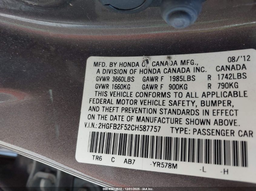2012 HONDA CIVIC 2012 року Бензин, 1.8, Передний привод, vin - 2HGFB2F52CH587757 из США
