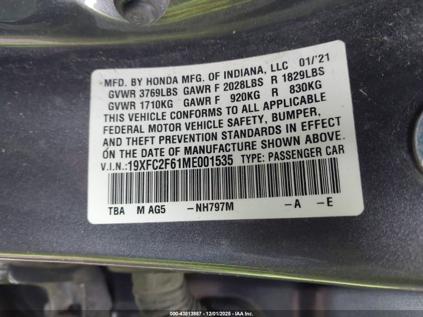 2021 HONDA CIVIC 2021 року Бензин, 2.0, Передний привод, vin - 19XFC2F61ME001535 из США