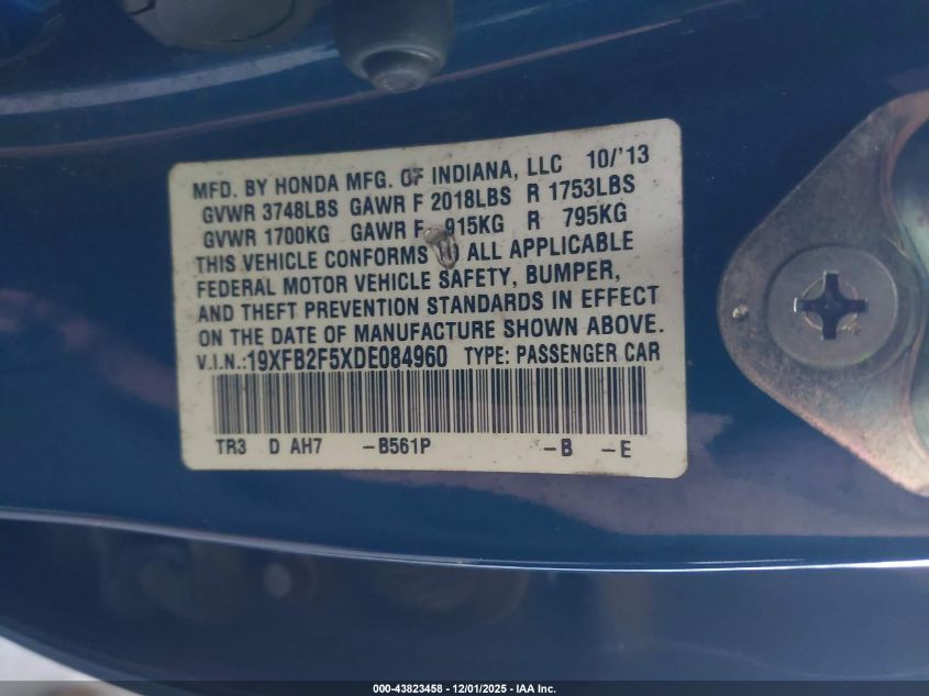 2013 HONDA CIVIC 2013 року Бензин, 1.8, Передний привод, vin - 19XFB2F5XDE084960 из США
