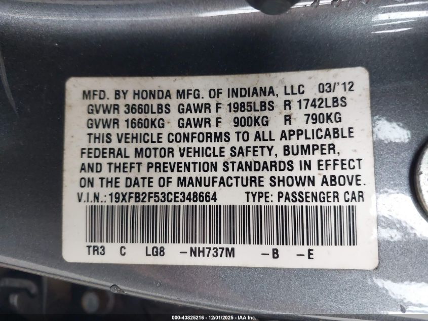 2012 HONDA CIVIC 2012 року Бензин, 1.8, Передний привод, vin - 19XFB2F53CE348664 из США