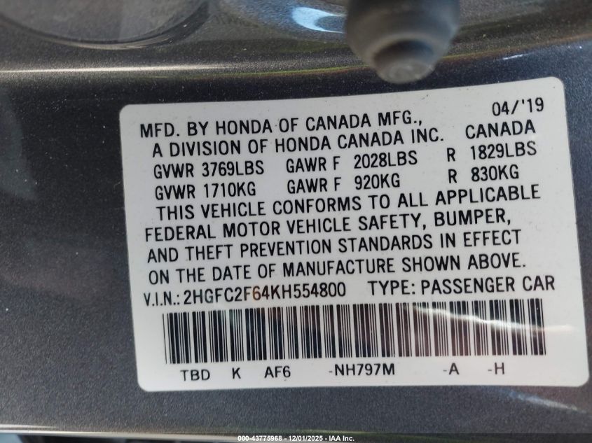 2019 HONDA CIVIC 2019 року Бензин, 2.0, Передний привод, vin - 2HGFC2F64KH554800 из США