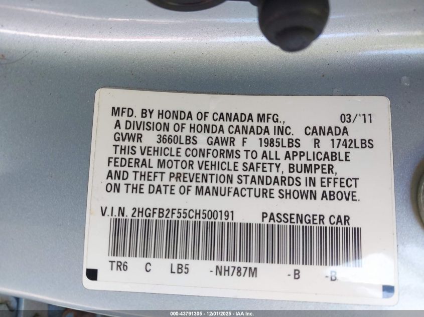 2012 HONDA CIVIC 2012 року Бензин, 1.8, Передний привод, vin - 2HGFB2F55CH500191 из США