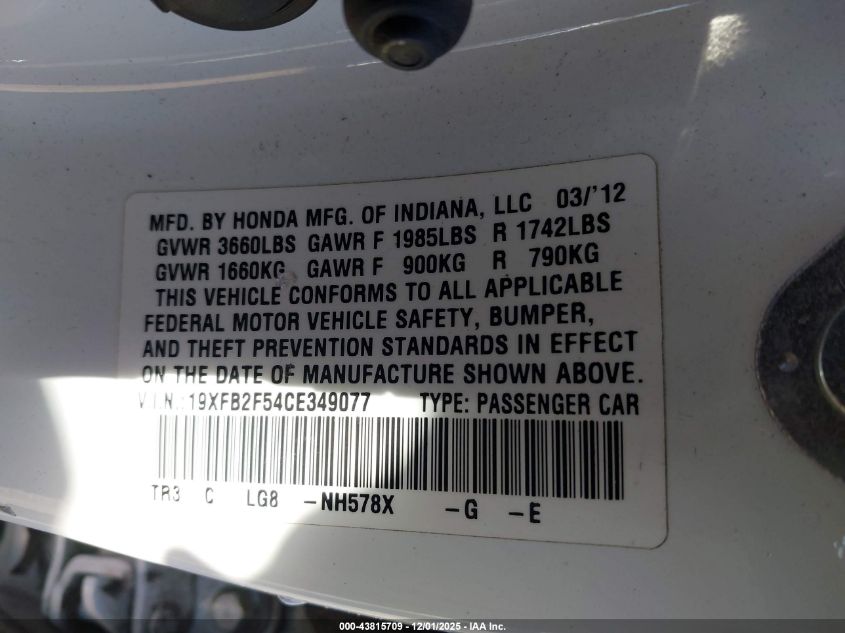 Цвет БелыйЦилиндры 4Привод Передний приводVIN 19XFB2F54CE349077Состояние Заводится и едет (проверено)Повреждения Передняя или задняя AutoRIA