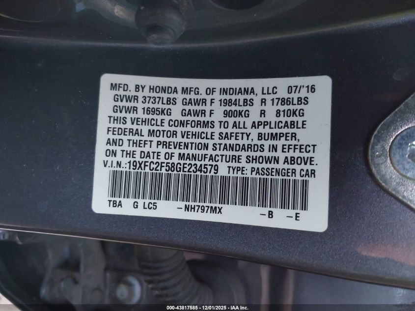 2016 HONDA CIVIC 2016 року Бензин, 2.0, Передний привод, vin - 19XFC2F58GE234579 из США