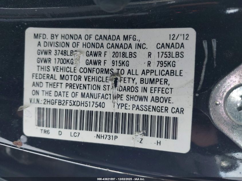 2013 HONDA CIVIC 2013 року Бензин, 1.8, Передний привод, vin - 2HGFB2F5XDH517540 из США