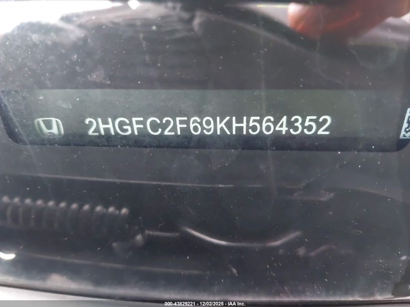 2019 HONDA CIVIC 2019 року Бензин, 2.0, Передний привод, vin - 2HGFC2F69KH564352 из США