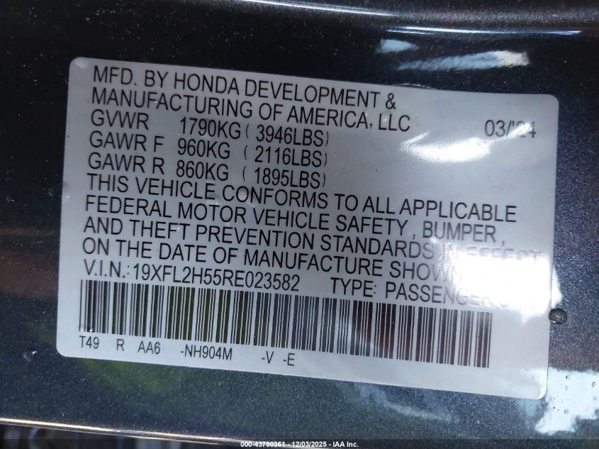 2024 HONDA CIVIC 2024 року Бензин, 2.0, Передний привод, vin - 19XFL2H55RE023582 из США