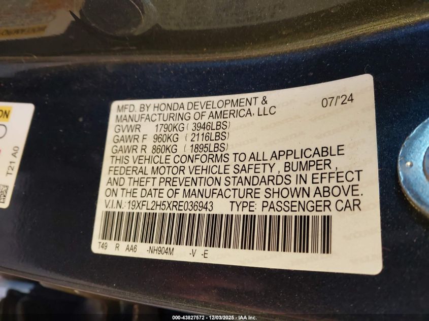 2024 HONDA CIVIC 2024 року Бензин, 2.0, Передний привод, vin - 19XFL2H5XRE036943 из США