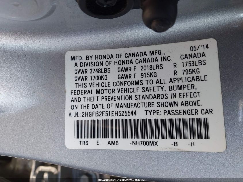 2014 HONDA CIVIC 2014 року Бензин, 1.8, Передний привод, vin - 2HGFB2F51EH525544 из США