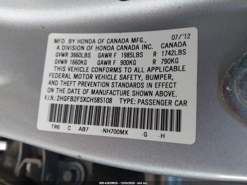 2012 HONDA CIVIC 2012 року Бензин, 1.8, Передний привод, vin - 2HGFB2F5XCH585108 из США
