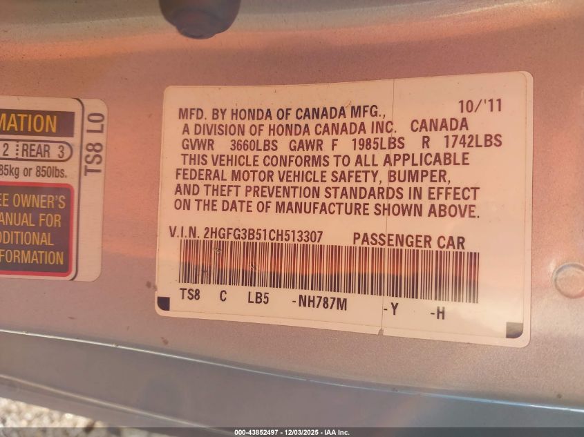2012 HONDA CIVIC 2012 року Бензин, 1.8, Передний привод, vin - 2HGFG3B51CH513307 из США