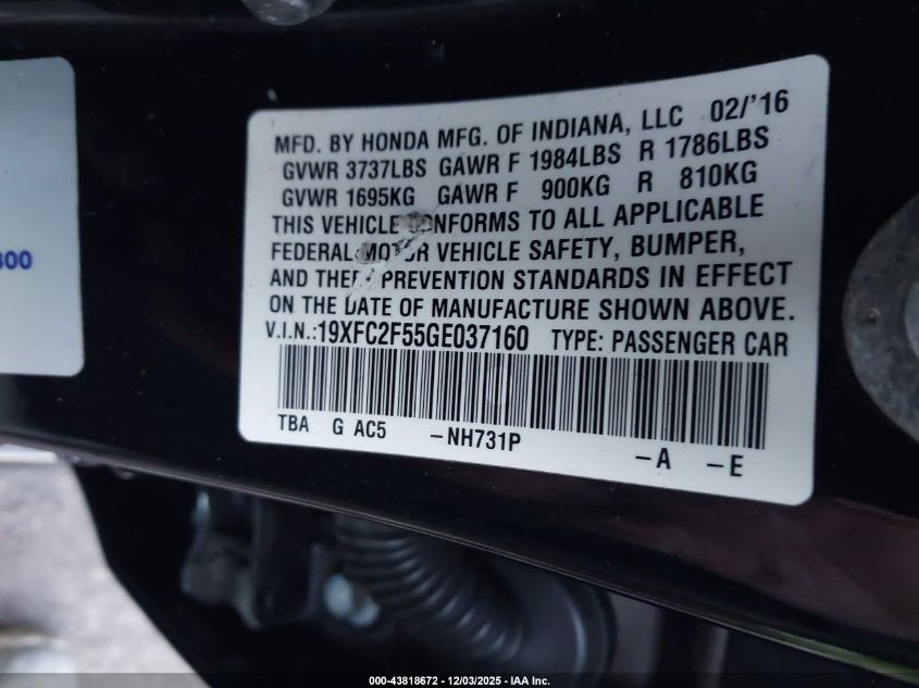 2016 HONDA CIVIC 2016 року Бензин, 2.0, Передний привод, vin - 19XFC2F55GE037160 из США