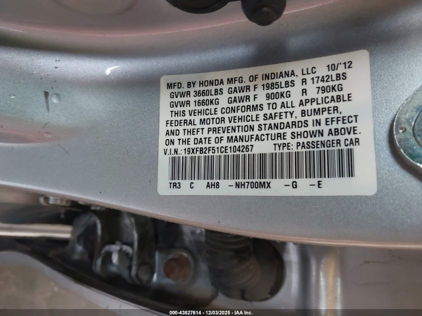 2012 HONDA CIVIC 2012 року Бензин, 1.8, Передний привод, vin - 19XFB2F51CE104267 из США