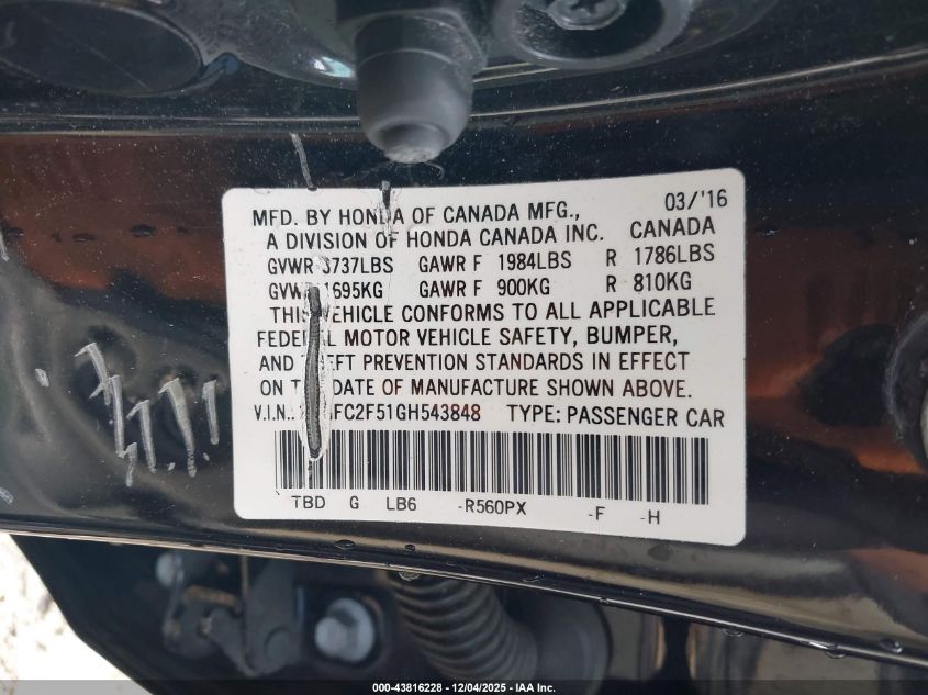 2016 HONDA CIVIC 2016 року Бензин, 2.0, Передний привод, vin - 2HGFC2F51GH543848 из США